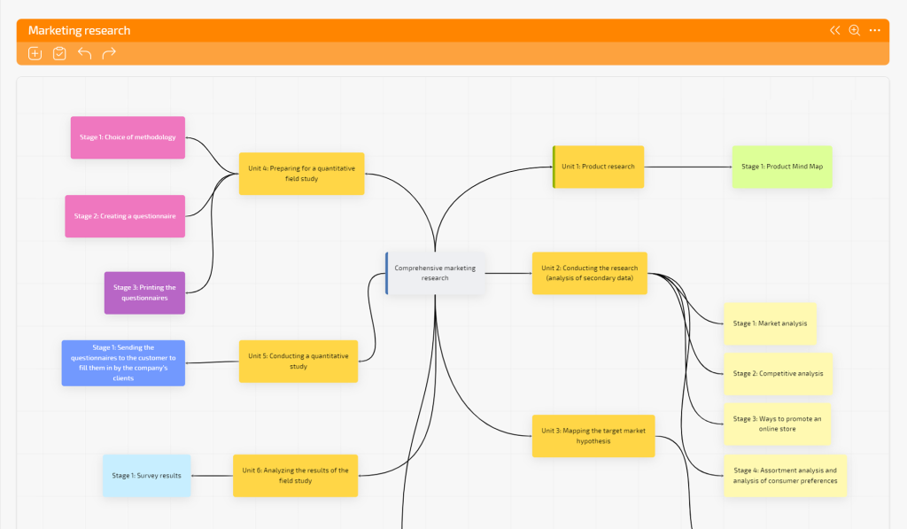 Using a mind map, you can turn an idea into a project, break it down into tasks, assign employees to complete these tasks, communicate within the tasks, and navigate through the entire project until it’s fully executed – all within a single platform and without relying on external programs and services.